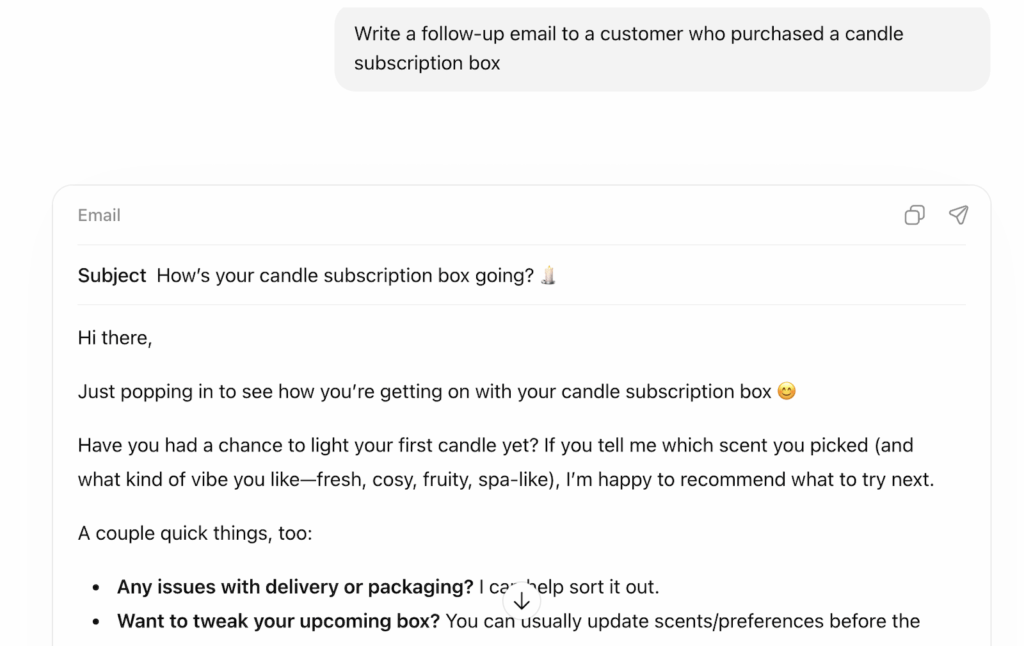 É aqui que as ferramentas de IA têm feito uma diferença real para os proprietários de pequenas empresas. Em vez de ficar olhando para uma tela em branco tentando escrever um e-mail de acompanhamento ou uma campanha promocional, você pode usar a IA para gerar um rascunho inicial forte em segundos.