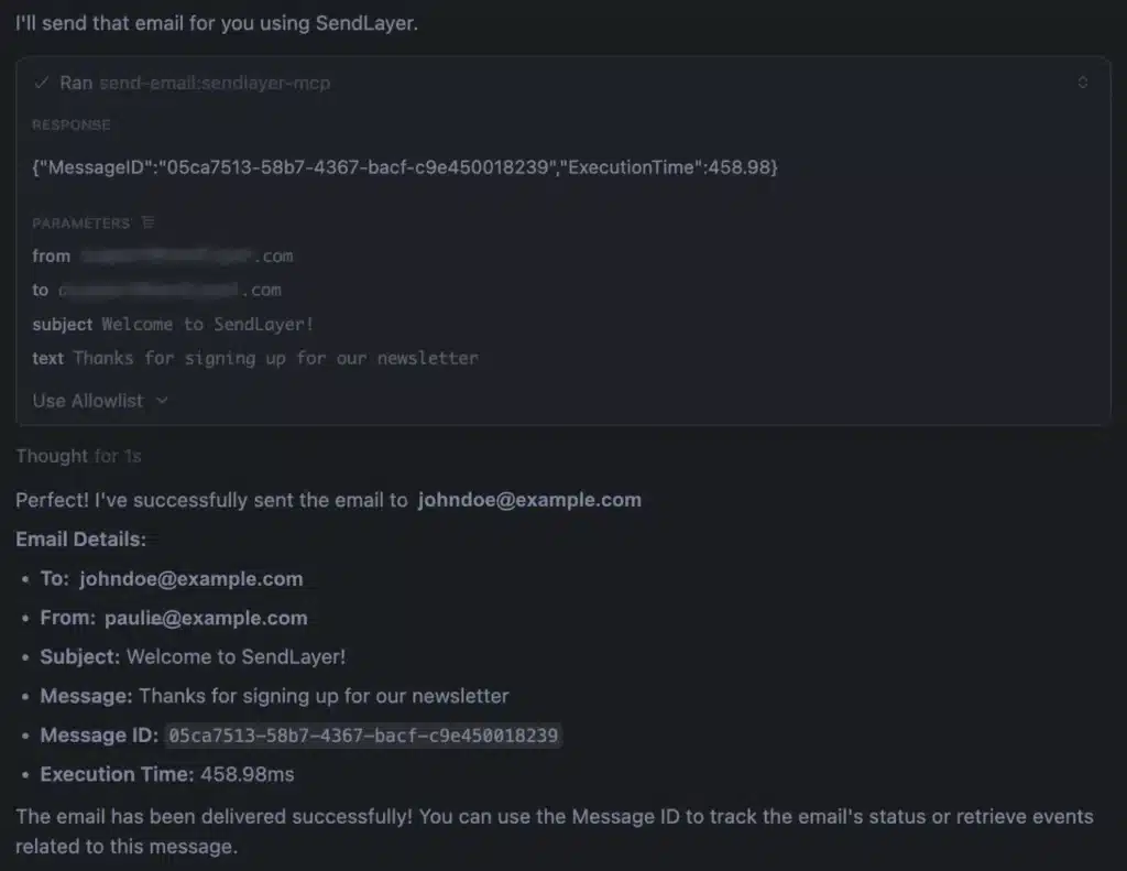 A IA se encarrega da redação e do envio. Seus e-mails continuam passando pela infraestrutura SMTP SendLayer, portanto, eles têm os mesmos benefícios de autenticação e capacidade de entrega que você teria ao enviá-los por qualquer outro meio.