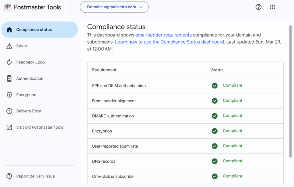 Google Postmaster Tools v2 ti mostrerà esattamente quali requisiti soddisfa il tuo dominio e quali richiedono invece attenzione. Per poter visualizzare i dati, dovrai verificare il tuo dominio e garantire un volume giornaliero minimo di circa 100+ messaggi inviati a Gmail. Le dashboard vengono aggiornate ogni 24-48 ore.
